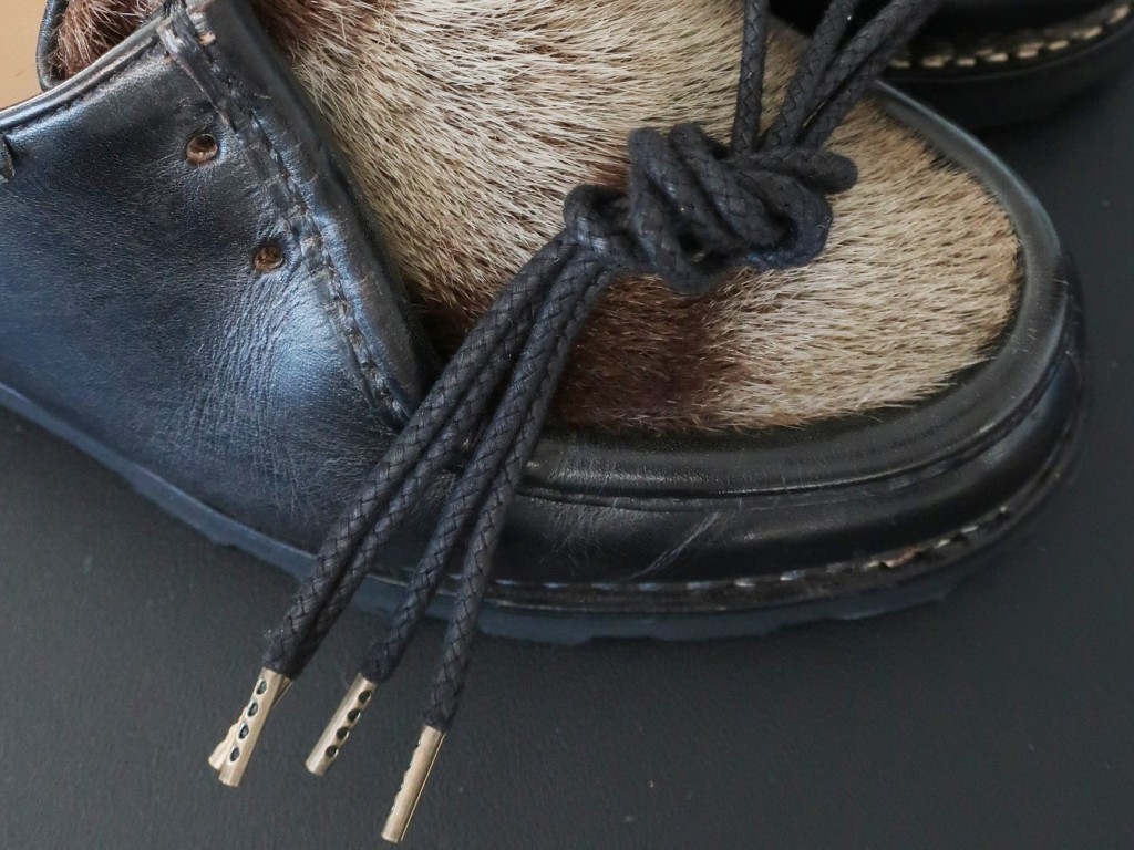 靴紐は楽天でセミオーダーの物を購入済。編み感のある太い黒紐に、アグレットは金属(アンティークカラ―)になったものをチョイス。