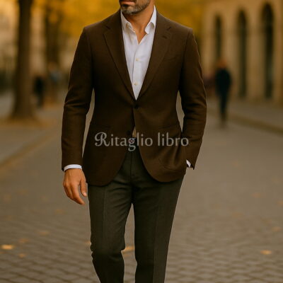 春風に誘われるように、カフェテラスでくつろぐ姿を想像させるこのコーディネートは、洗練された都会的魅力に溢れています。落ち着いたブラウンのトーンに躍動感のあるストライプが印象的なスーツと、清潔感のあるブルーシャツの組み合わせで構成されています。