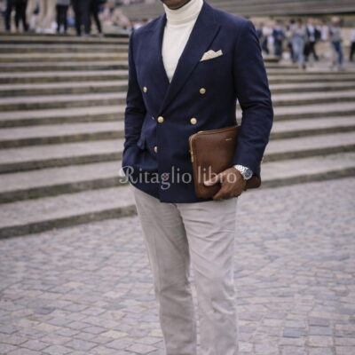 ダブルブレストのブラウンスーツは、秋のシーズンにぴったりの落ち着いたカラーリングとクラシックなデザインが特徴です。トーンの異なるブラウンタイを同系色で合わせ、スーツ全体に統一感を持たせつつ、スマートな印象を与えます。淡いブルーのシャツがさりげなくアクセントとなり、スーツの深みを引き立てています。足元は黒のドレスシューズでしっかりと締め、洗練された大人のスタイルを完成させています。