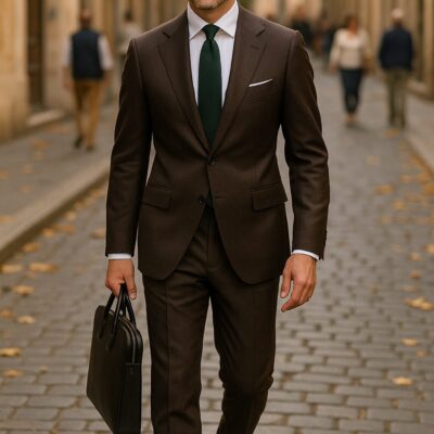 深みのあるダークブラウンスーツは、秋冬シーズンに最も映える色合いのひとつです。ホワイトシャツを合わせることで清潔感を保ちながら、ダークグリーンのネクタイを差し色として取り入れることで落ち着きと洒落感を両立。さらに、足元には黒のダブルモンクストラップシューズを選び、同じ黒のレザーブリーフケースで統一感を出すことで、全体がぐっと引き締まります。クラシコイタリア的な柔らかい仕立てに深い色味を掛け合わせることで、ビジネスはもちろん、フォーマルな場面でも自信を持って着こなせる、大人の秋スーツスタイルです。
