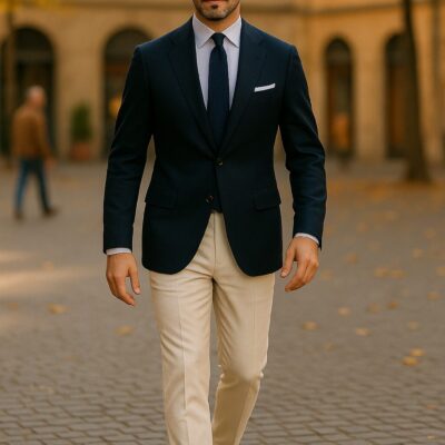 ネイビージャケットとベージュスラックスの組み合わせは、クラシコイタリアを代表する黄金バランス。ジャケットの深いネイビーが落ち着きと品格を与える一方、ベージュのパンツが軽快さを演出し、都会的で爽やかな印象を作り出します。白シャツを合わせることで清潔感が一層際立ち、さらにネイビーニットタイを加えることで程よいカジュアル感をプラス。足元はブラウンスエードローファーで季節感を意識し、全体を柔らかくまとめています。オンでもオフでも活躍できる、大人の秋コーデの好例です。