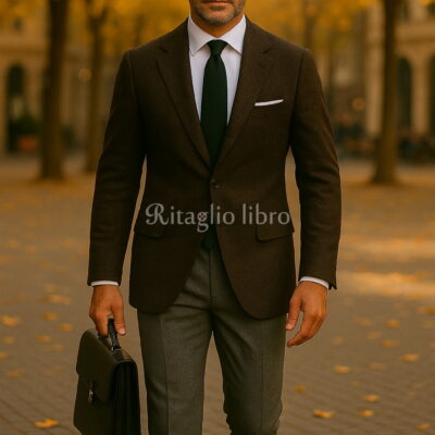 深みのあるブラウンジャケットにホワイトシャツを合わせ、清潔感と落ち着きを両立したスタイル。ネクタイはダークグリーンを選ぶことで、ブラウンとの相性が良く、秋らしい季節感を演出しています。パンツにはミディアムグレーのスラックスを取り入れることで、ジャケットとのコントラストを柔らげ、全体をシックにまとめています。さらにブラックのブリーフケースとシューズがビジネス感を引き締め、知的で信頼感ある印象をプラス。シンプルながらも配色の妙で魅せる、大人のビジネスカジュアルコーデです。
