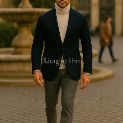 ネイビージャケットにオフホワイトのタートルネックを合わせることで、クラシックながらも柔らかな印象を与えるコーディネート。グレーチェックのスラックスはジャケットとの相性が良く、上品さと知的さを引き立てています。さらに、足元にホワイトスニーカーを選ぶことで、フォーマルな要素を程よく崩し、都会的でリラックス感のあるスタイルへと昇華。全体を落ち着いた色でまとめながらも、スニーカーで軽快さをプラスすることで、オフの日の街歩きやカジュアルディナーにも活躍できる、大人にふさわしいジャケパンコーデに仕上がっています。