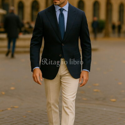 ネイビージャケットにサックスブルーのシャツを合わせることで、清潔感と爽やかさを演出しつつ、ネイビーネクタイで統一感を持たせています。パンツにオフホワイトのスラックスを選ぶことで、コントラストの効いた軽快なスタイルに。特に秋の黄葉シーンとの相性も抜群で、都会的で洗練された印象を与えます。足元はブラウンスエードローファーを合わせ、柔らかさと上質感をプラス。ビジネスカジュアルはもちろん、ディナーやイベントにも対応可能な、クラシコイタリアらしい大人の王道ジャケパンコーデです。