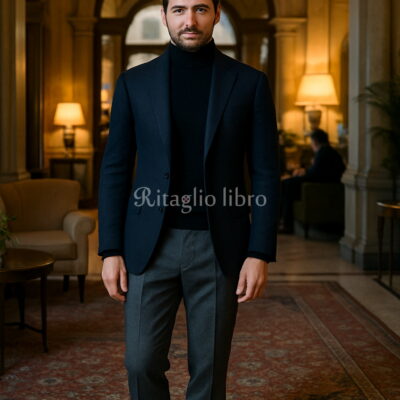 ネイビージャケットに黒タートルを合わせた、冬の王道ともいえる大人の組み合わせ。顔まわりはキリッと締まり、全体をモダンに見せる効果があります。さらにグレースラックスを合わせれば、色味のコントラストが整い、ミニマルで洗練された印象に。ポイントは、タートルを“薄手〜中厚手”に抑えること。肩が盛り上がらず、ジャケット本来の美しいシルエットを邪魔しません。アクセサリーは極力控え、素材の良さで勝負するのがクラシコ流。冬のビジネスからディナーまで幅広く対応できる万能コーデです。