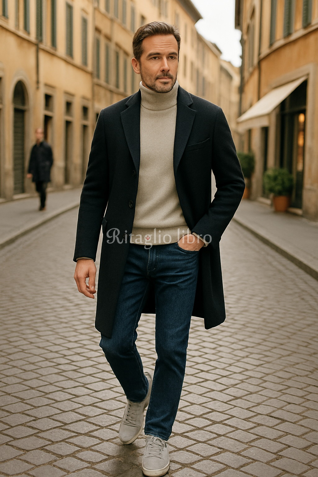 ネイビーコートをより洗練された印象で着こなしたいなら、淡いライトグレーのタートルネックを合わせる“クリーン配色”が効果的です。ネイビーの深みを柔らかく中和しつつ、顔まわりを明るく見せてくれるため、冬でも重たくならず爽やかにまとまります。濃紺デニムを合わせることで、カジュアルながらも大人の品をキープ。色の濃淡が自然な縦のラインを生み、脚長効果も期待できます。