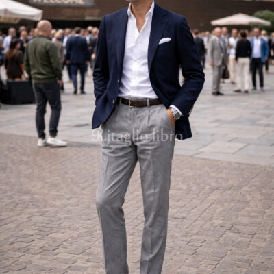 ネイビージャケットとグレースラックスの定番配色を、素材感と立体だけで成立させた引き算スタイル