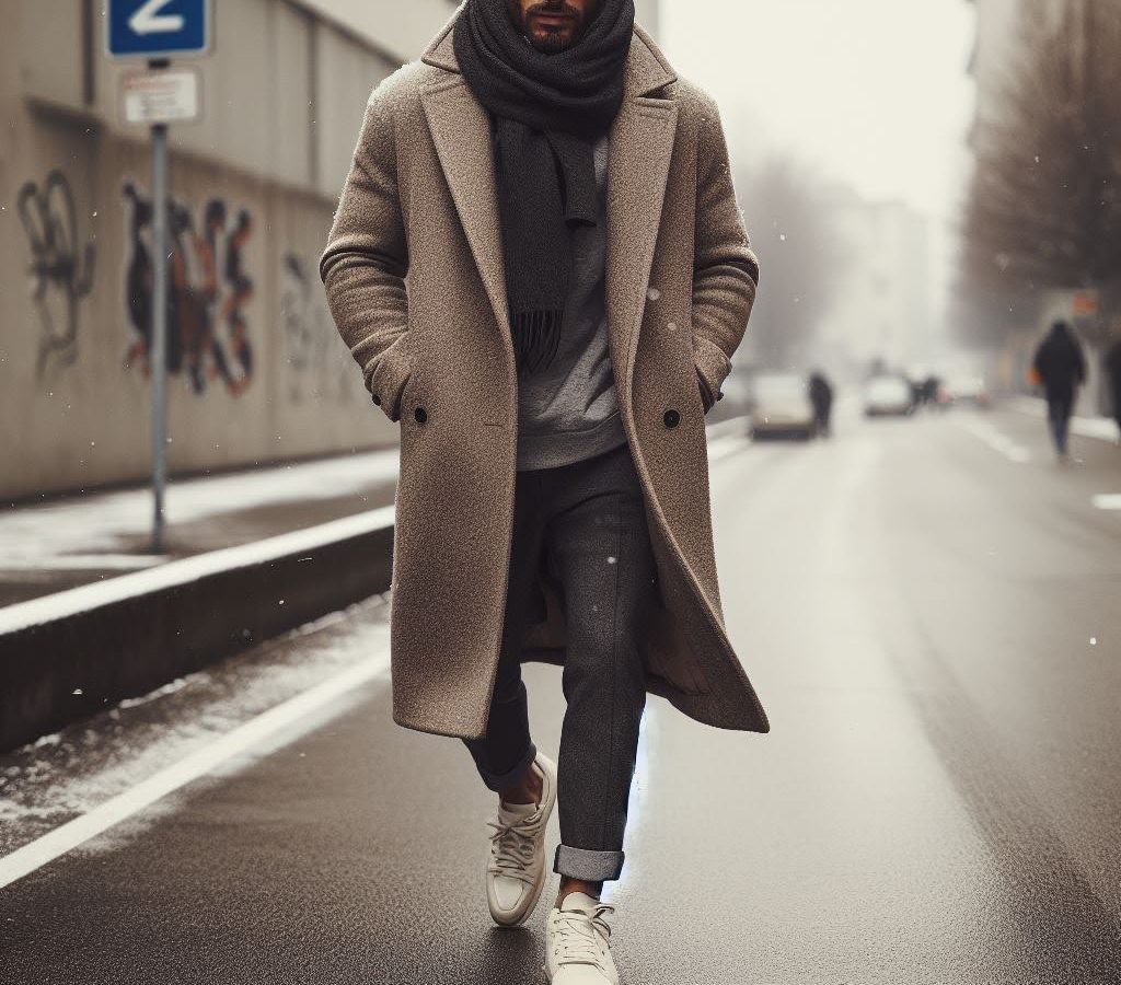 また、レザーシューズよりスニーカーを合わせる方が、全体が軽くまとまり、冬の重たい雰囲気を中和してくれます。白やグレーなど上品な配色のスニーカーなら、コートの端正さを崩しすぎず、大人の雰囲気を損なわないまま快適性も手に入ります。