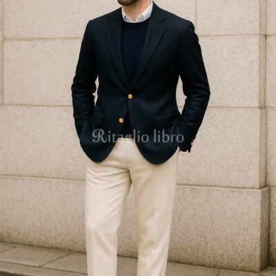 ネイビーブレザー×ホワイトパンツでつくる冬の大人マリン|黒スエードローファーで締める上品コーデ|チルコロ&ジェルマーノをおすすめ