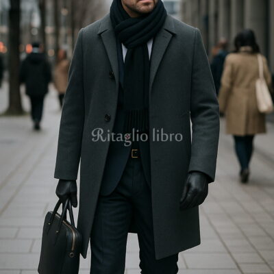 ブラックチェスターコートとグレーのストールで魅せるモダンなビジネススタイル
