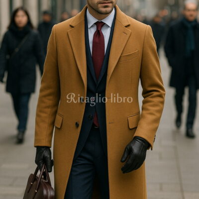 キャメルコート×ネイビースーツ×赤タイの冬ビジネスコーデ|華やかさと品を両立する大人の配色術