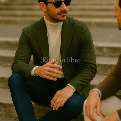オリーブジャケット×タートルネック×デニム|大人の洗練カジュアルコーデ|ラルディーニをおすすめ